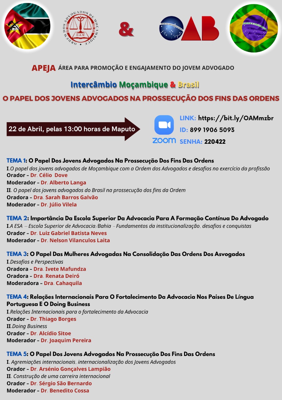 Esta iniciativa é patrocinada pelas Ordem dos Advogados de Moçambique e Ordem dos Advogados do Brasil e pode ser assistida online através da aplicação Zoom, no endereço: https://bit.ly/OAMmzbr a partir das 13:00 Horas de Maputo, do dia 22 de Abril.